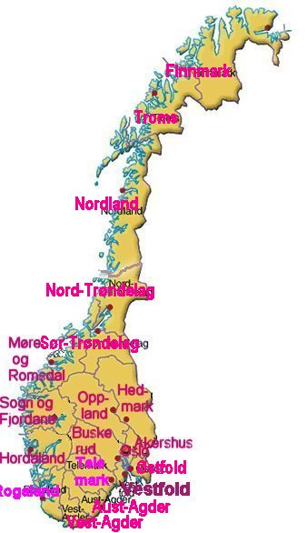 Update May 2015: When using Digitalarkivet to search the Census-information, the field 'Birthplace' can be a good primary criteria. In the lists presented, the birthplace contains Aurdal, Ourdal, Ourdahl, Slidre / Slidri, Slir(e/æ/i), Valdres, Valders, Walders, Waldres a.s.o. The first lists were created in 2008 and finished in 2009 .Click here to find main table of the search - This applies to "the old database" which will be unavailable at the "Digitalarkivet" in the near? future. In 2014 another way of presenting the lists - now with excerpts of DA's new databases - was made, via spreadsheet to webformat. Now the censuses 1865, 1875, 1885, 1900 and 1910 are presented on one webpage pr. "Fylke" (County). It's difficult to make good statistics of origin when a lot of persons has been given *Valders* as birthplace, even if some names are good indicators on where the persons cradle once upon the time was wagging on the floor. Below you will find a hyperlinked map - point and click on the "Fylke" you want the list from. Beside the map is a table of number of personn in each "Fylke" |